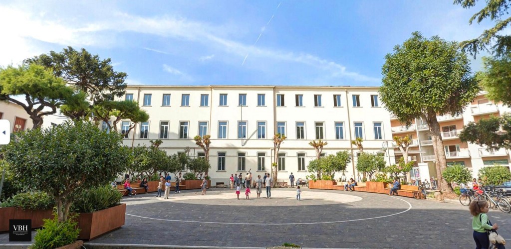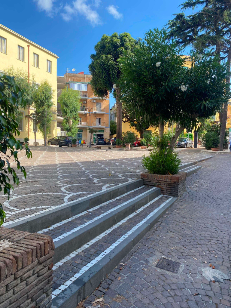 Piazza G. Marconi diventa la nuova Agorà mediterranea della città: uno spazio civico pedonale e flessibile. L’abbiamo ridisegnata attraverso un anello in pietra lavica vesuviana che ordina gli attraversamenti e una superficie centrale in pietra chiara per ospitare eventi e socialità. Sul perimetro, fioriere modulari in corten ospitano vegetazione mediterranea (ulivi nani, agrumi, lavanda, mirto).